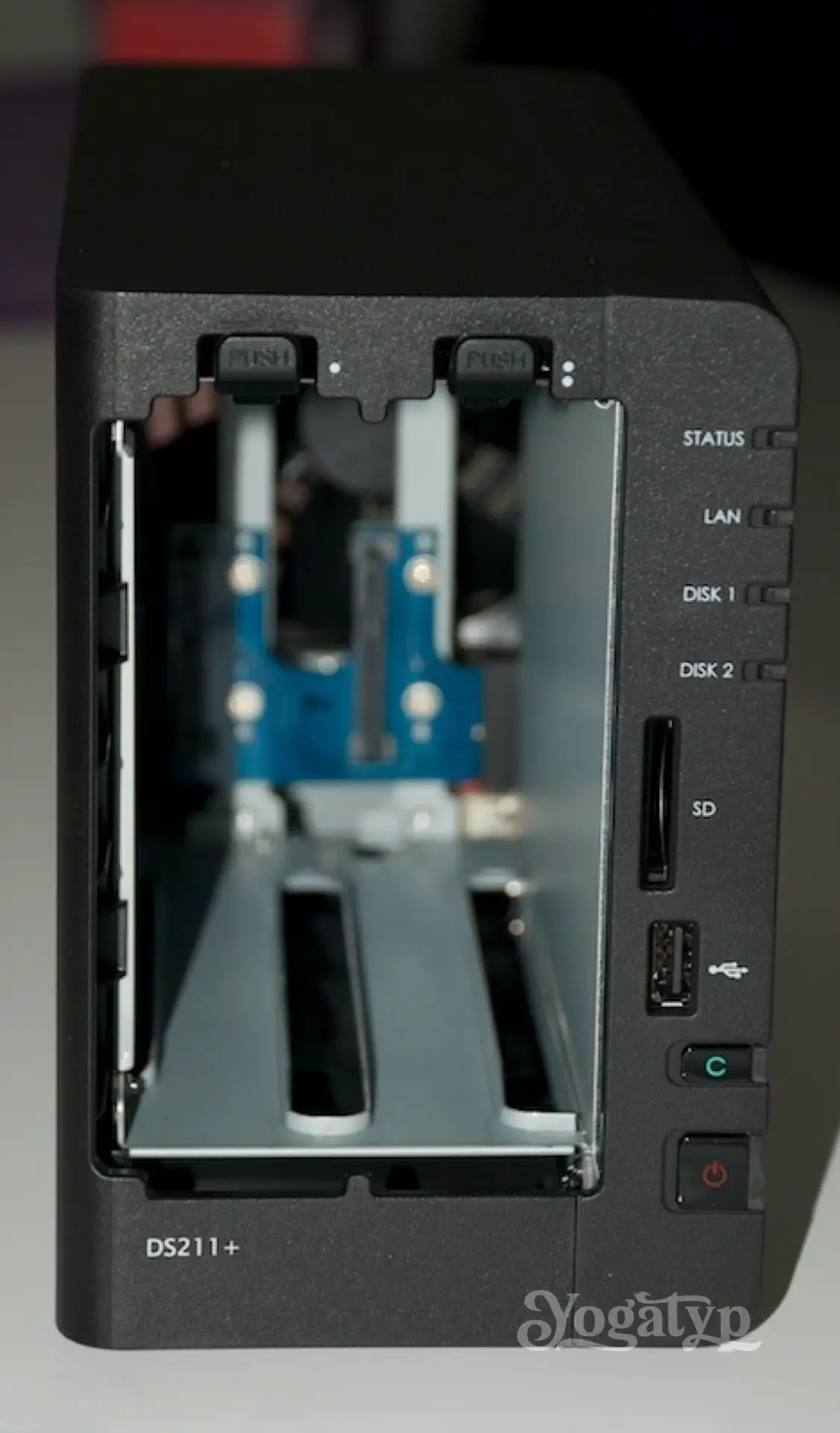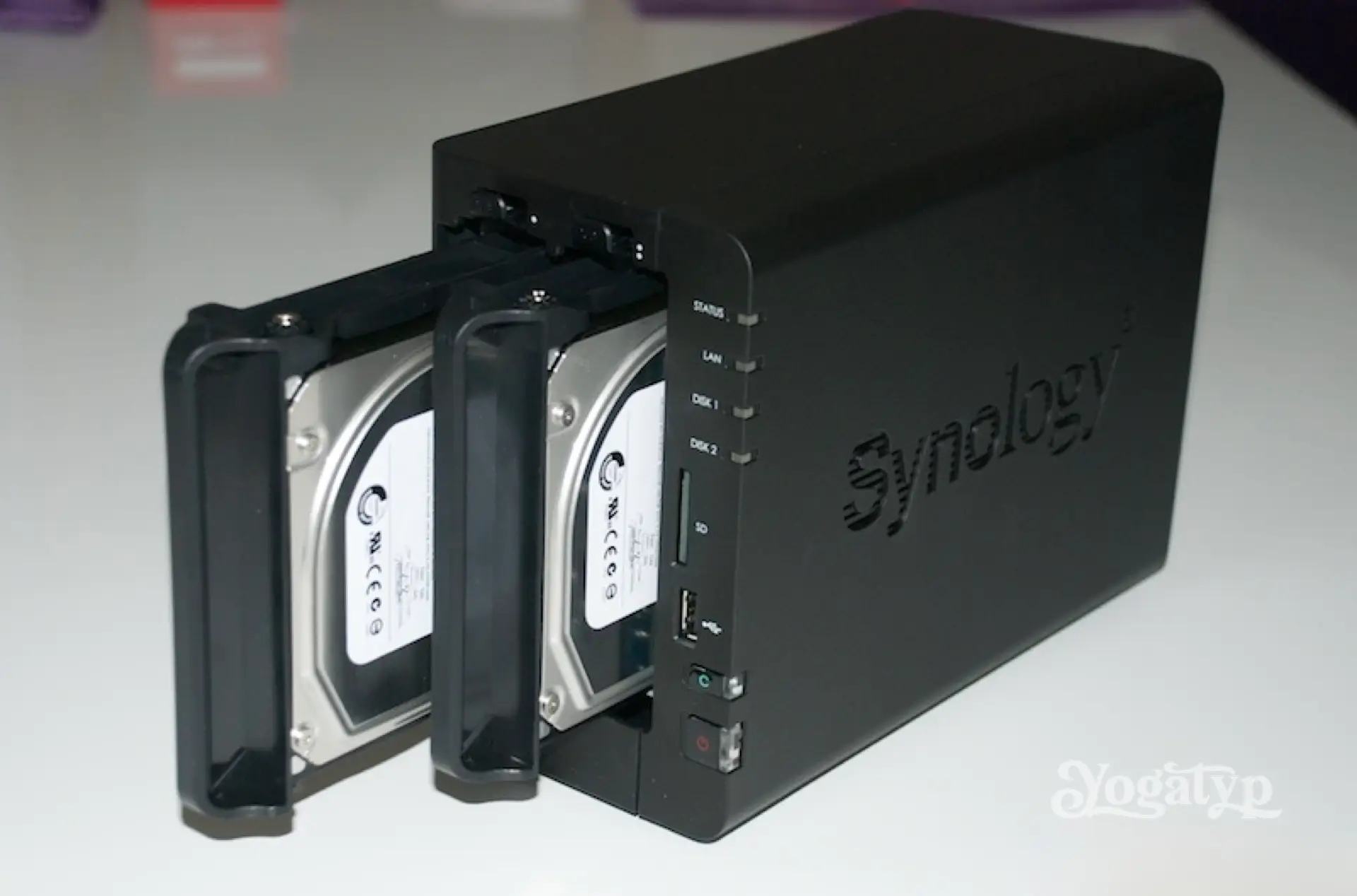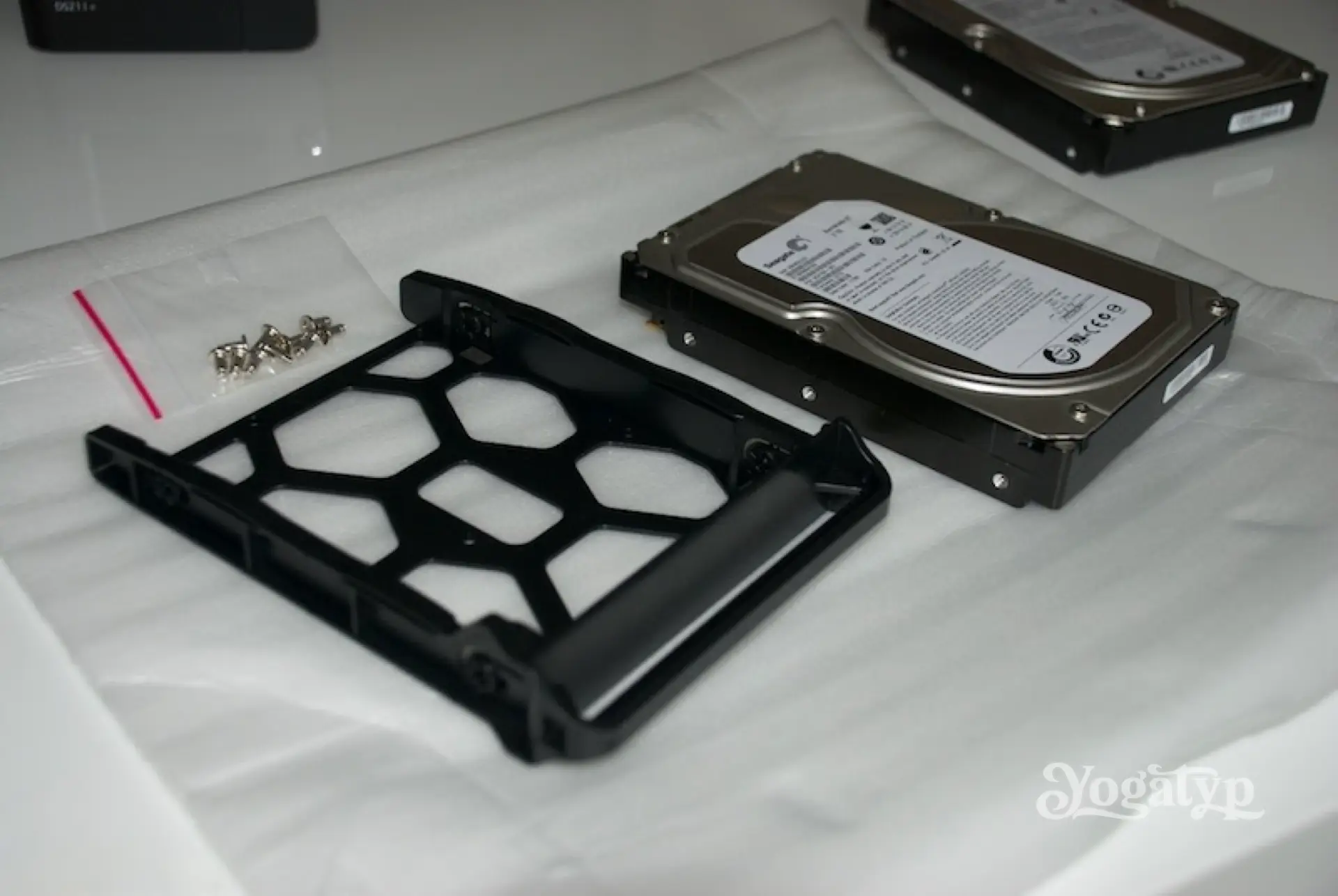 Die im hübschen und sicheren Karton beigelegte Anleitung kann links liegen gelassen werden. Der Einbau der Festplatten ist kinderleicht. Die HotSwap-fähigen Laufwerksrahmen oben entriegeln und herausziehen. Im Lieferumfang sind reichlich Schrauben für 3,5″ und 2,5″ Laufwerke. Also Festplatten auf die Rahmen legen, verschrauben und so in die beiden Schächte im Synology-Gehäuse schieben, bis es Klick macht. Die schwarze Frontblende ‘aufklicken’ und … Fertig!