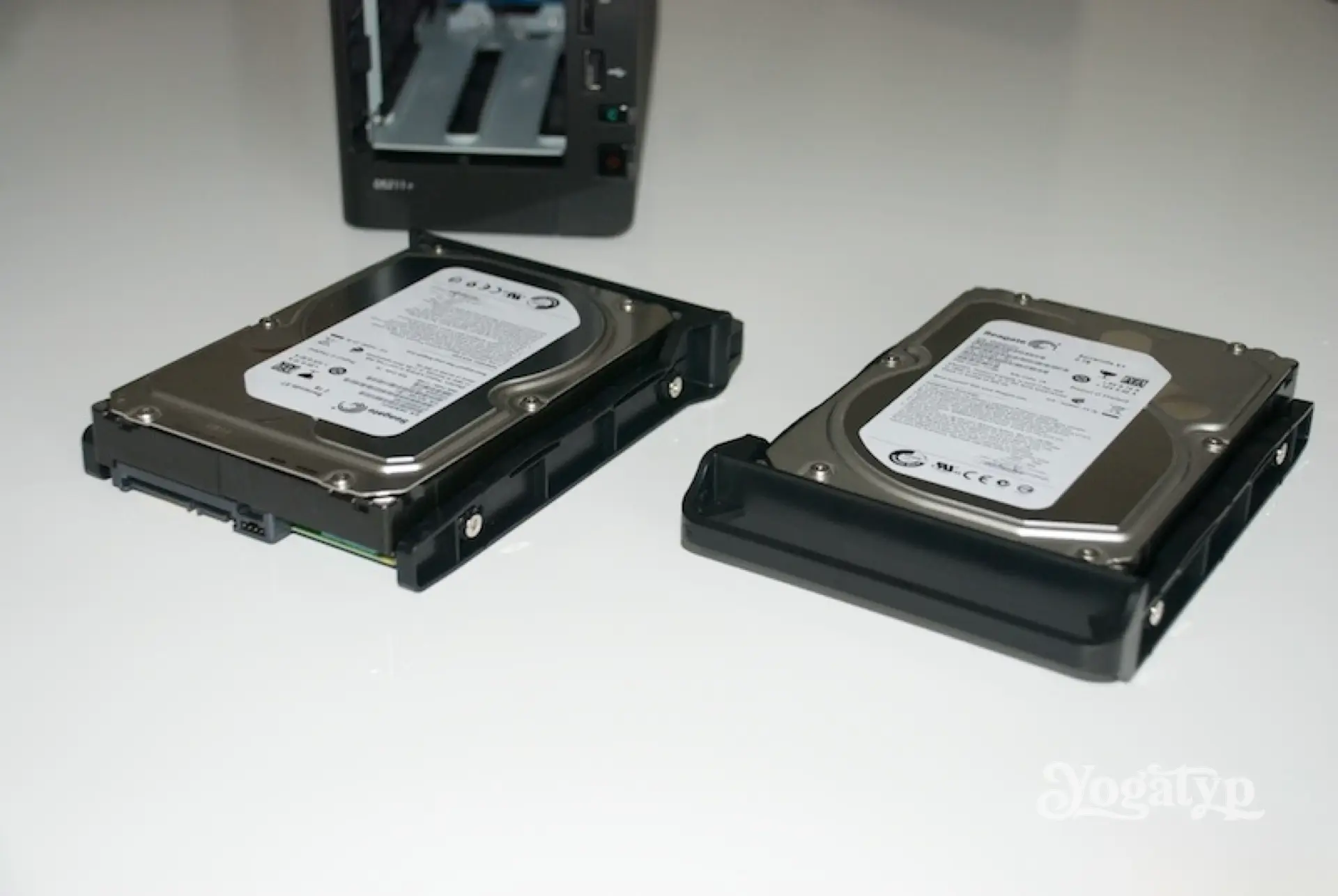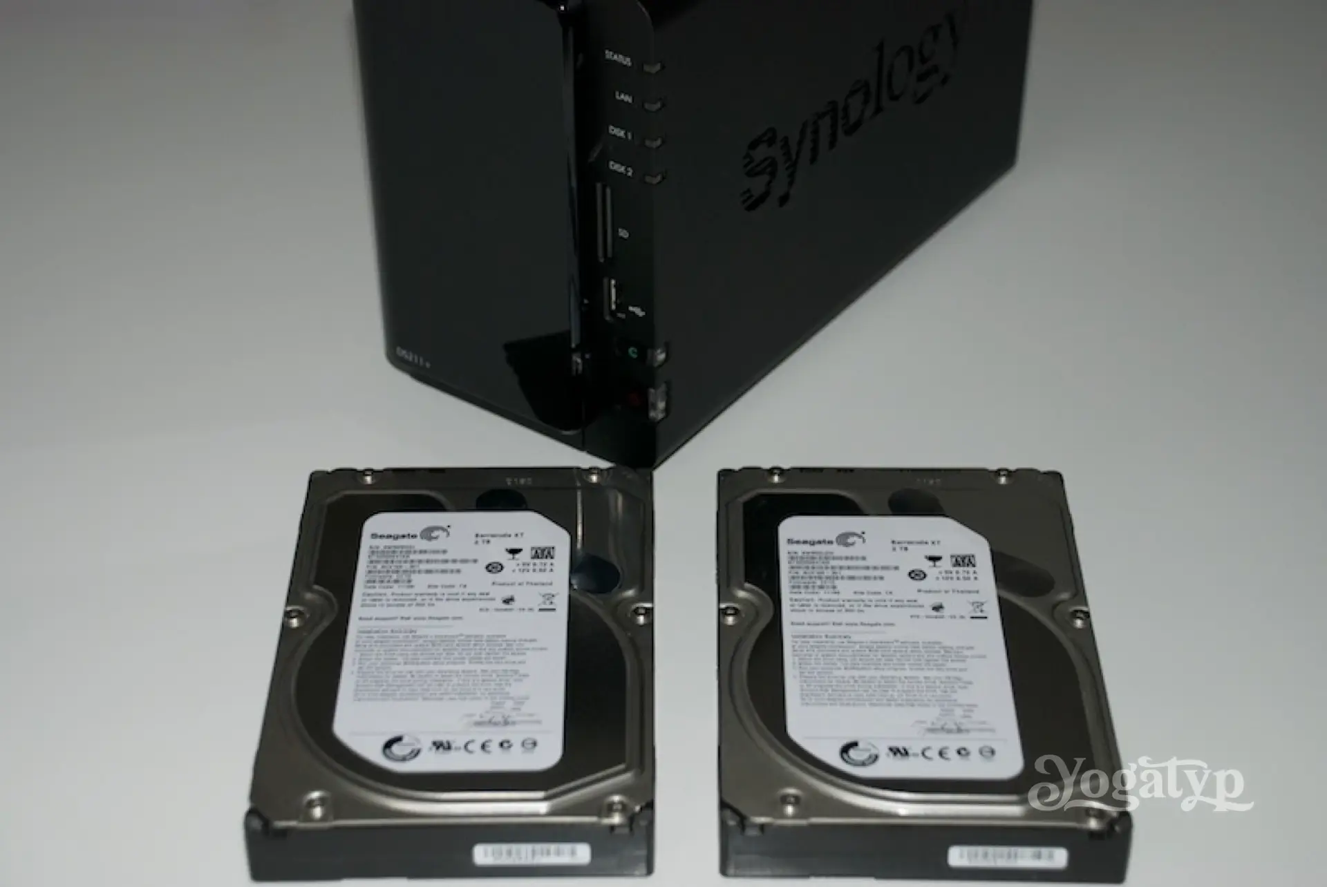 Im vorliegenden Testaufbau fanden 2 Festplatten ihre Verwendung. Diese waren vom Typ Seagate ST32000641AS (Reklame) mit jeweils 2 TB. Mit speziell diesem Modell habe ich übrigens allerbeste Erfahrungen gemacht, äquivalent zu den Ergebnissen anderer Nutzer im World Web Web. Diese 7200er-Harddrives sind absolut für den Dauerbetrieb geeignet, die Schnittstelle ist das aktuelle SATA 6Gb/s. Des Weiteren ist die Seagate ist in allen Belangen für ein mechanisches Laufwerk sehr fix. Weiter locken eine mittlere Ausfallzeit von 750.000 Stunden und die dem gehobenen Preis entsprechenden 5 Jahre Garantie. Sollen es doch andere Festplatten sein, so empfehle ich den Blick auf die Kompatibilitätsliste von Synology.