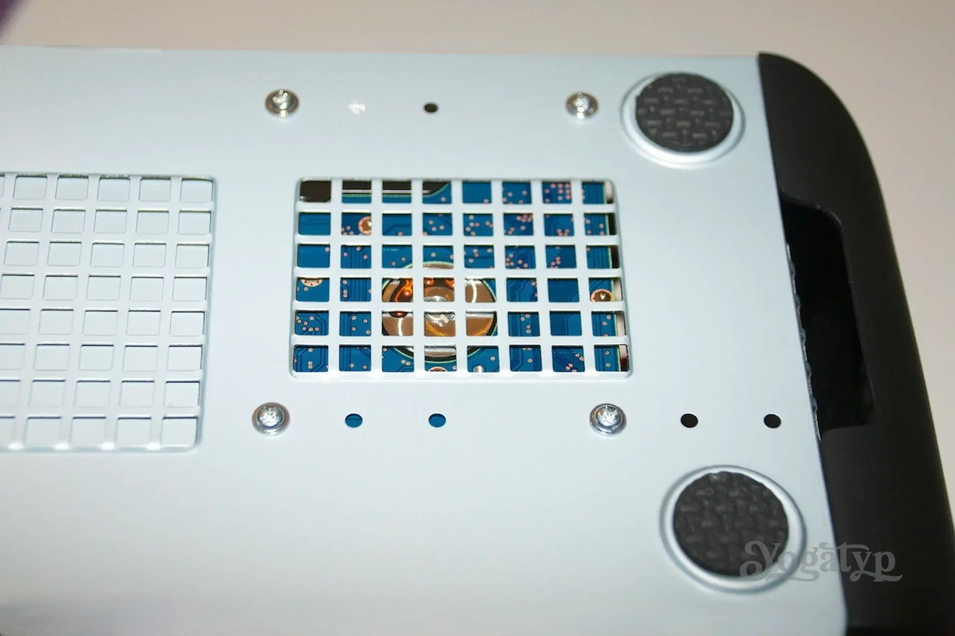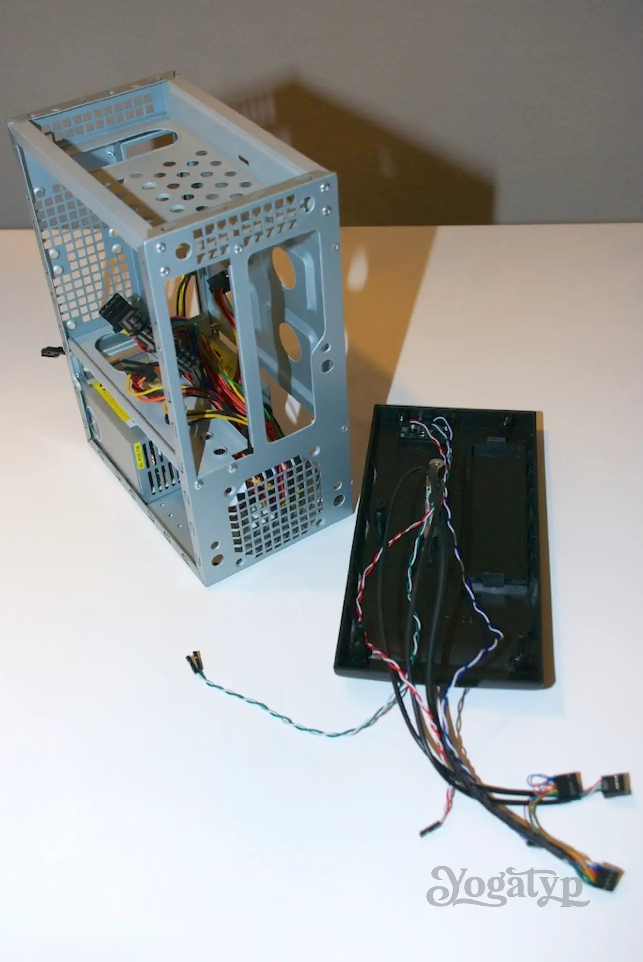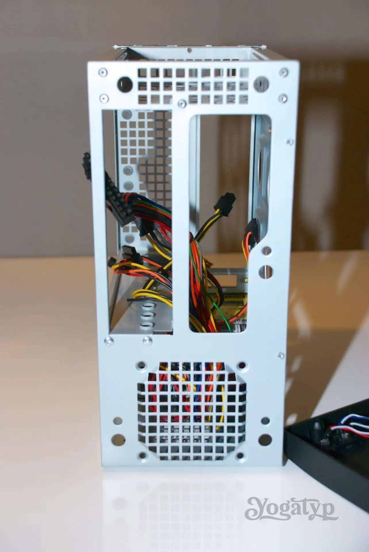 Das Gehäuse hinlegen, die Anschlussblende vom Mainboard in die Aussparung am Gehäuse einklemmen. Arbeitsspeicher in das Mainboard stecken. Nun das Mainboard in die Anschlussblende dirigieren und passend auf den Gewinden der Abstandshalter setzen und verschrauben. Jetzt das 2,5″ Laufwerk nehmen und gleich Strom und SATA-Stecker dort konnektieren. Nun wird das Laufwerk auf dem Gehäuseboden, Aufkleber nach oben, Anschlüsse nach hinten (Richtung Mainboard) so auf den Boden platziert, dass man es von der Gehäuseunterseite her passend verschrauben kann.