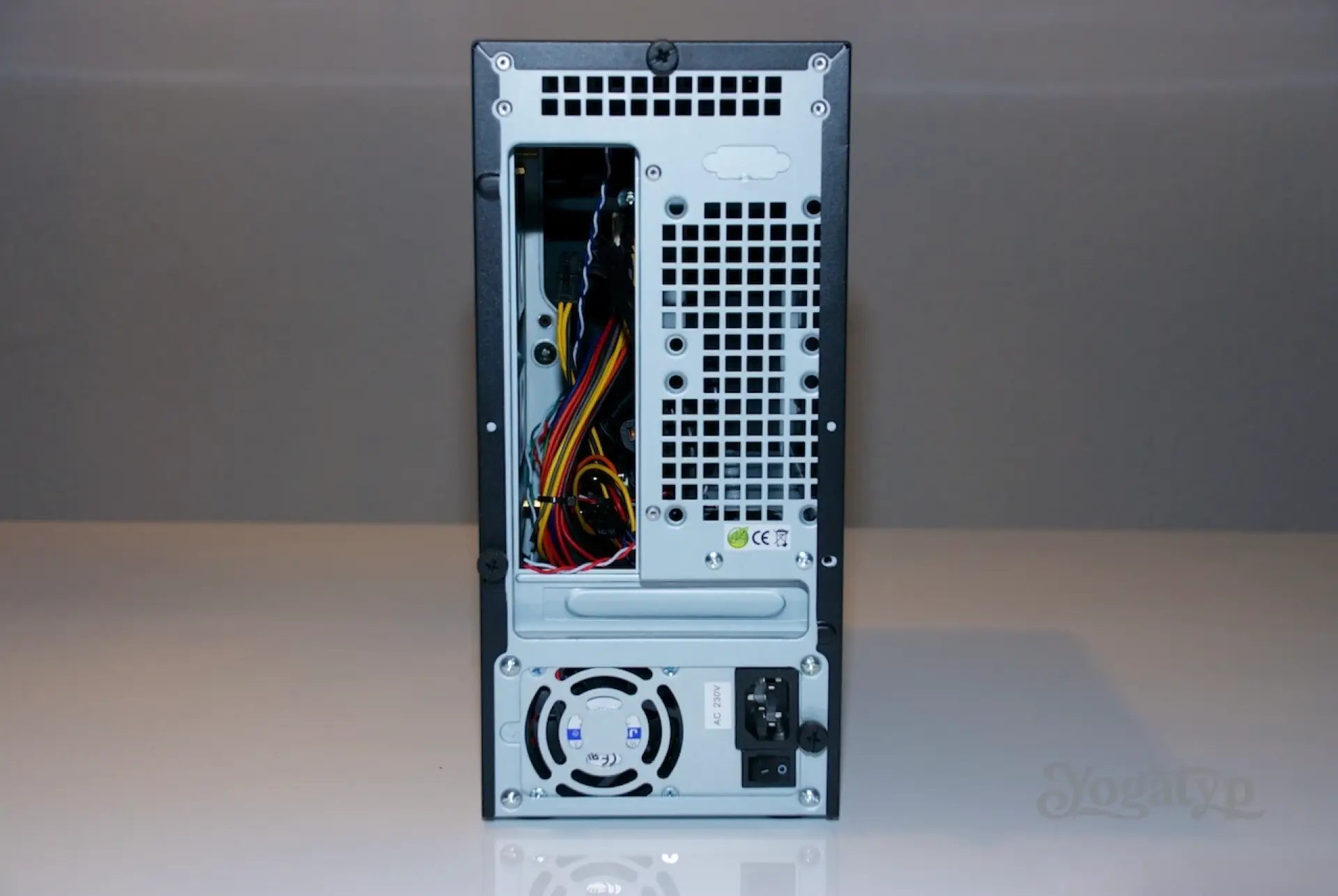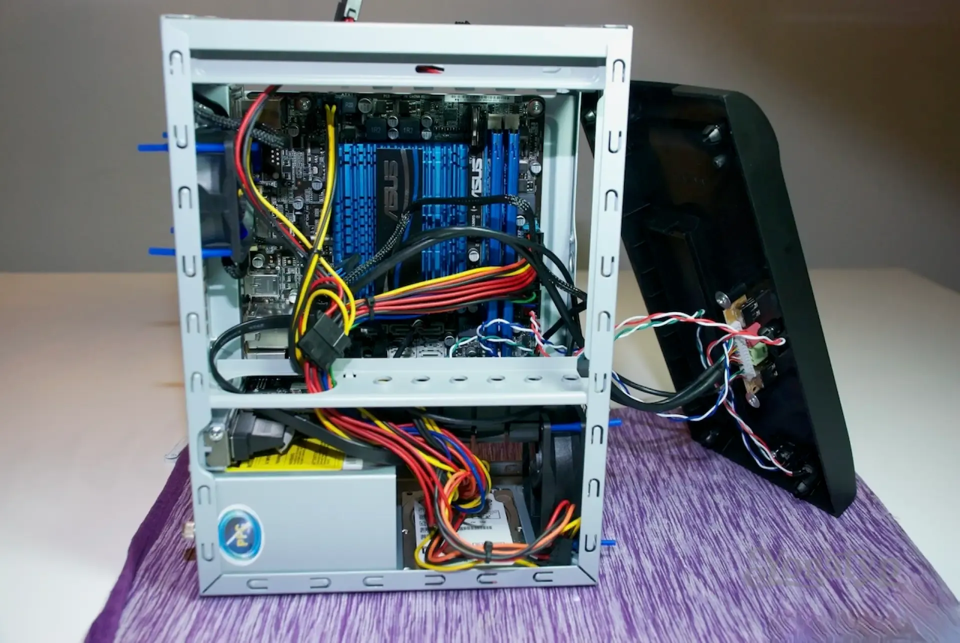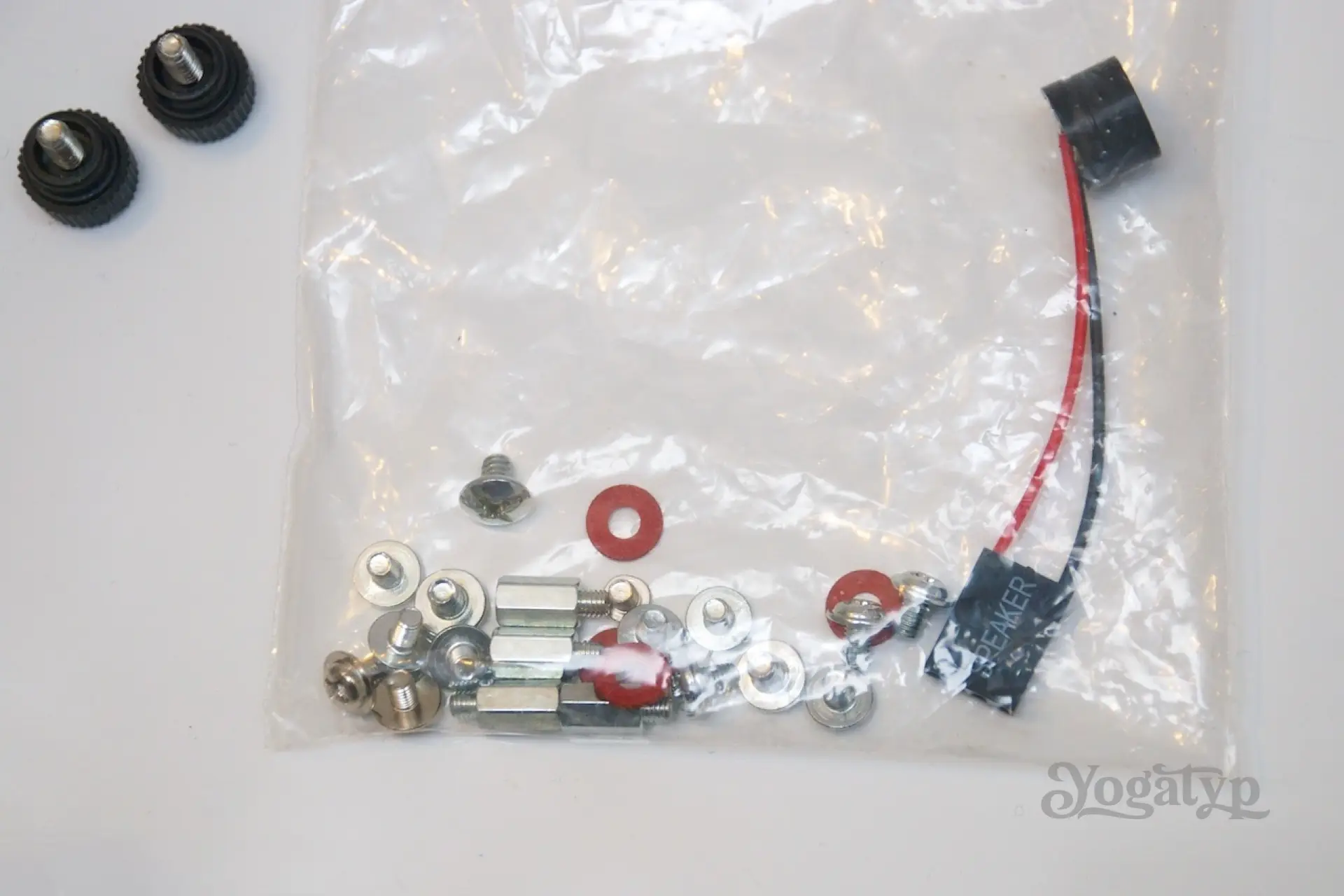 Das Gehäuse hinlegen, die Anschlussblende vom Mainboard in die Aussparung am Gehäuse einklemmen. Arbeitsspeicher in das Mainboard stecken. Nun das Mainboard in die Anschlussblende dirigieren und passend auf den Gewinden der Abstandshalter setzen und verschrauben. Jetzt das 2,5″ Laufwerk nehmen und gleich Strom und SATA-Stecker dort konnektieren. Nun wird das Laufwerk auf dem Gehäuseboden, Aufkleber nach oben, Anschlüsse nach hinten (Richtung Mainboard) so auf den Boden platziert, dass man es von der Gehäuseunterseite her passend verschrauben kann.
