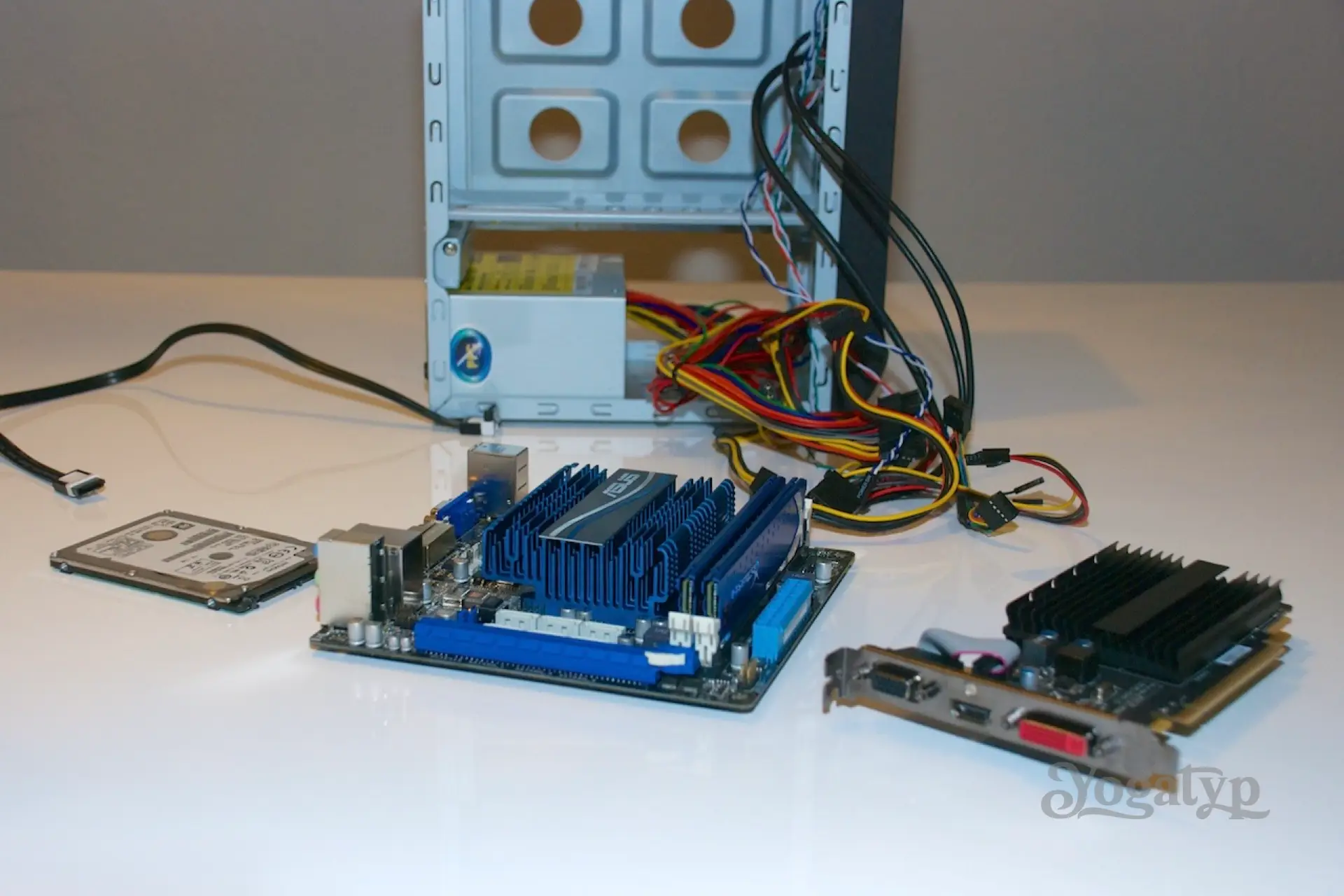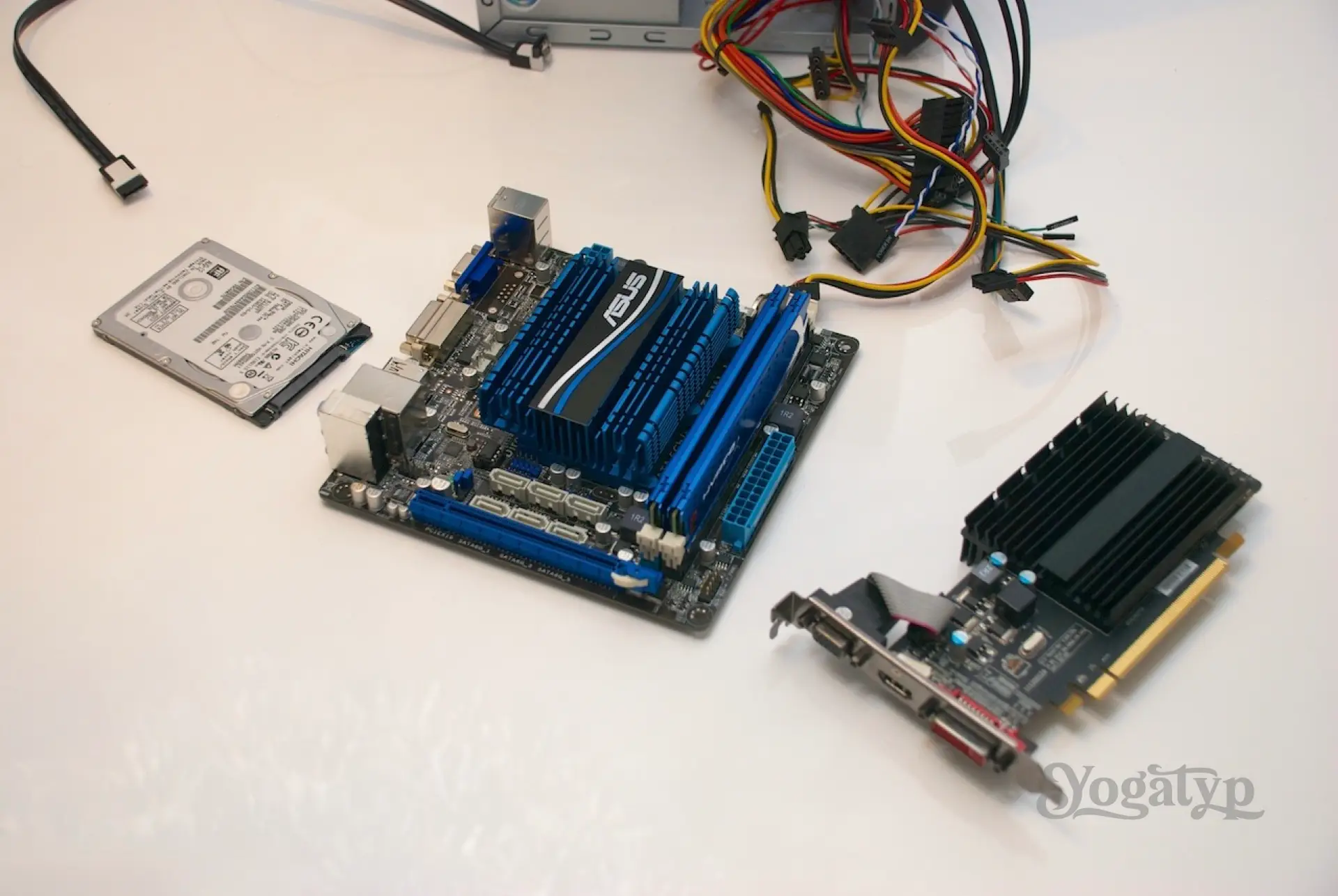 - Mainboard Asus E35M1-I (z.B. bei eBay erhältlich) oder das oben empfohlene Asus E35M1-M (dann ohne Extra-Grafikkarte)