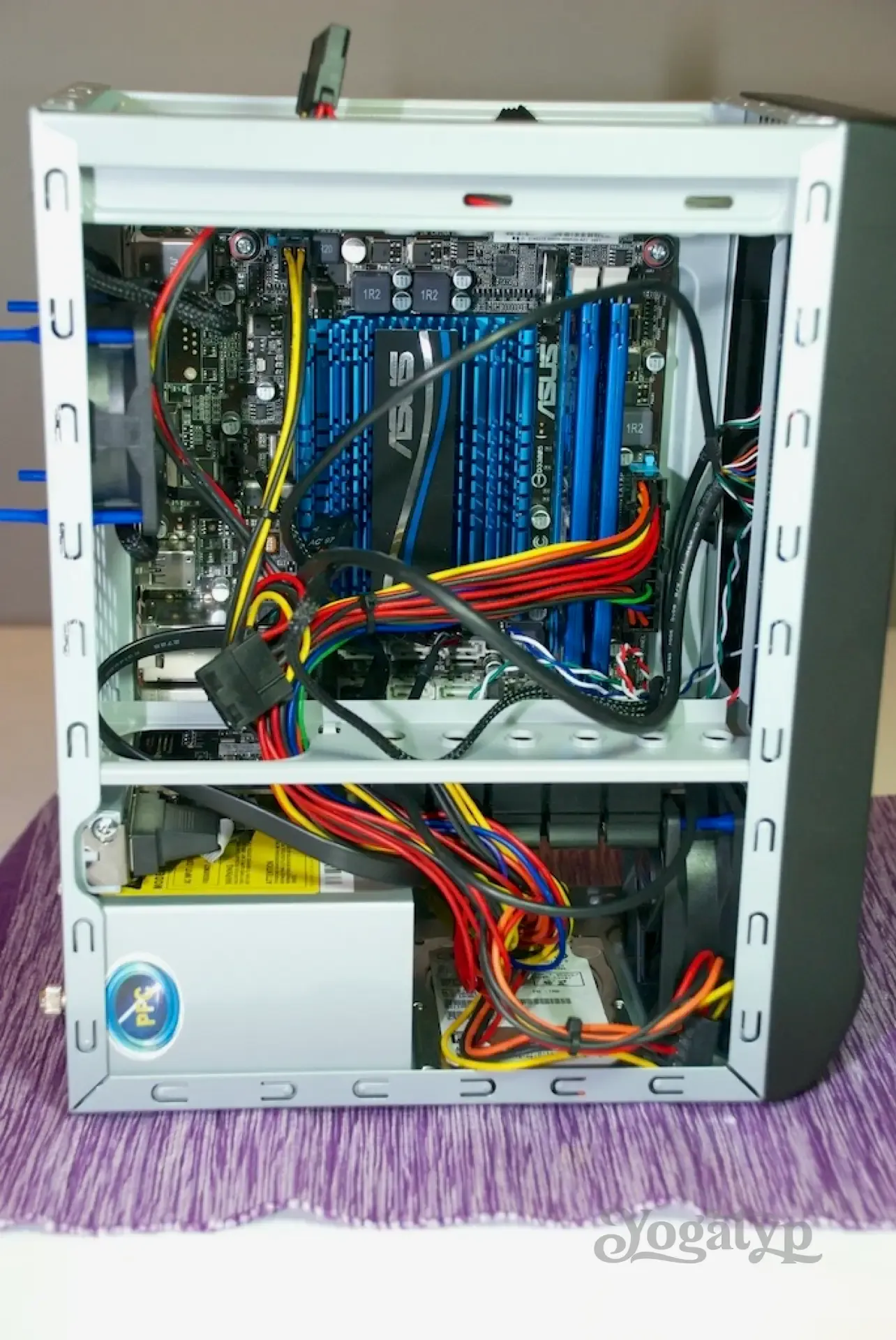 Jetzt wird die Grafikkarte in den PCI-E Slot gesteckt und das Slotblech verschraubt. Das Slotblech nicht ganz gegen die Schraube nach oben drücken, damit die HDMI-Buchse hinten nicht unter das Gehäuseblech rutscht! Als nächstes setzen wir das mittlere Blech wieder ein, führen die beiden Mainboard Stromversorgungskabel durch die linke ovale Öffnung von unten nach oben und stecken diese in die entsprechenden Buchsen an der Hauptplatine. Das Festplatten-SATA-Kabel kommt ins Mainboard (6 sind vorhanden, Nummer 1 links unten verwenden). Gehäusefront vorsichtig aufstecken. Hierbei kontrollieren, dass keine Käbelchen eingeklemmt werden oder in den unteren Frontlüfter geraten. Innen alle benutzten und unbenutzten Kabel so platzieren, dass diese nicht in die Lüfter geraten. Der Kontakt mit den passiven Kühlkörpern von CPU und Grafikkarte sollte ebenfalls nicht möglich sein. Hier kann man auch kleine Kabelbinder nutzen. Nun die Gehäuseschale wieder aufsetzen und verschrauben.