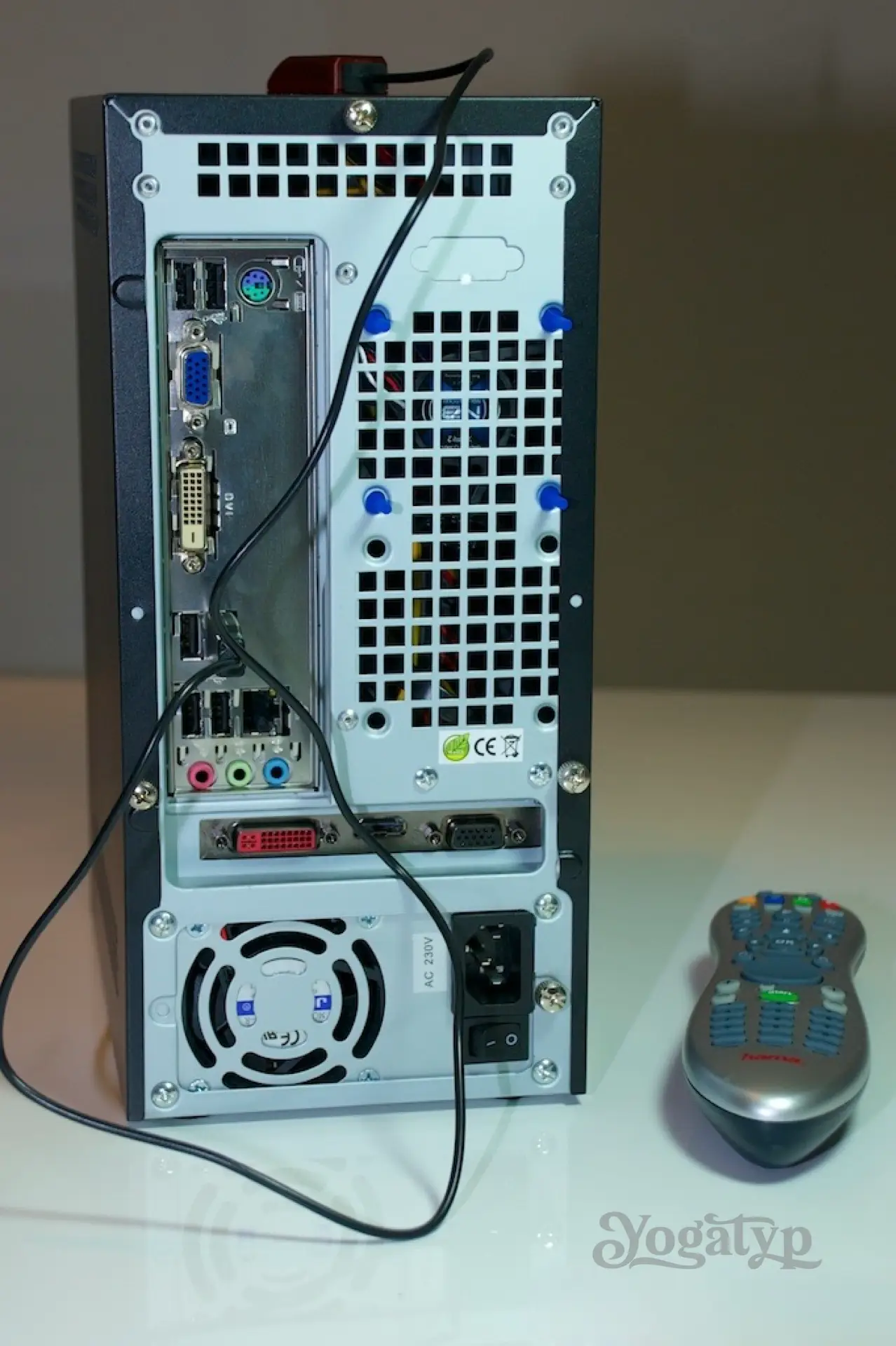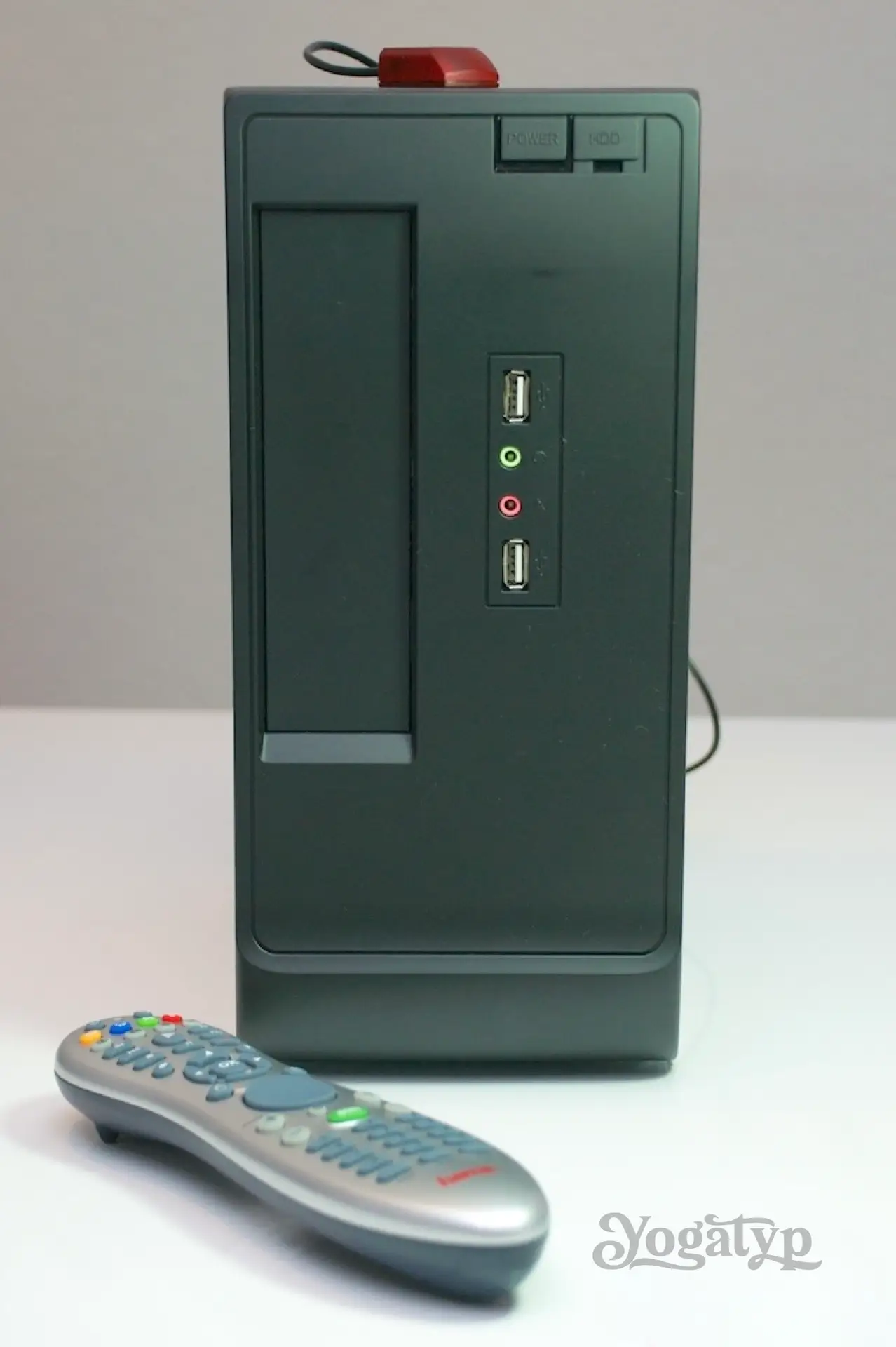 Hinten kommt der USB-Stecker des Infrarotadapteres von der Fernbedienung rein. Der rote Empfänger selbst kann oben aufs Gehäuse gelegt werden. Hauptsache, dieser ‘sieht’ die Fernbedienung. Ethernet anstöpseln, HDMI-Kabel vom Fernseher ebenso und fürs Einrichten von OpenELEC eine Tastatur anstecken. Ist OpenELEC drauf, was übrigens keine 3 Minuten dauert, kann die Tastatur für immer abgezogen werden.