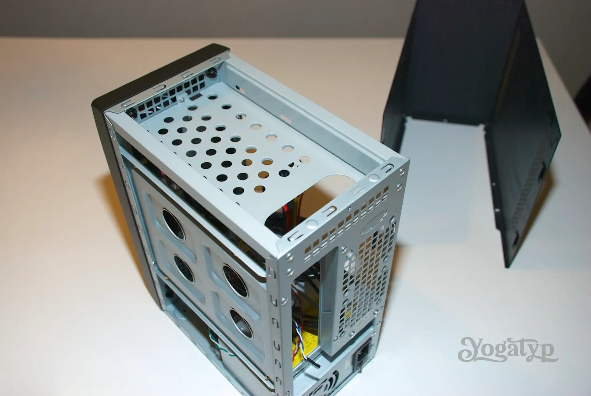 Am schwarzen Gehäuse die hinteren 3 Daumenschrauben lösen und das einteilige Außenteil nach hinten und oben abziehen. Sehr loben will ich an dieser Stelle, dass Chieftec schon ab Werk die Mainboard Abstandshalter fürs Mini-ITX Board gesetzt hat. Nun ziehen wir die Gehäusevorderseite aus Kunststoff vorsichtig ab. Hierzu einfach vorne oben am Plastik anfassen und vorsichtig, aber doch kräftig, vorne vom Gehäuse weg ziehen. Nachhelfen kann man ein wenig mit der freien Hand, welche innen die schwarzen Plastikschrauben des Vorderteils ein wenig zusammendrückt. Mit einem Mal macht es Klack und man hat das gesamte Vorderteil in der Hand. Nun bauen wir das in der Mitte befindliche Blech aus, welches das Gehäuse stabilisiert. Bitte merken, wie es ausgerichtet war. Hierzu werden von hinten und von vorne jeweils die zwei Schrauben gelöst.