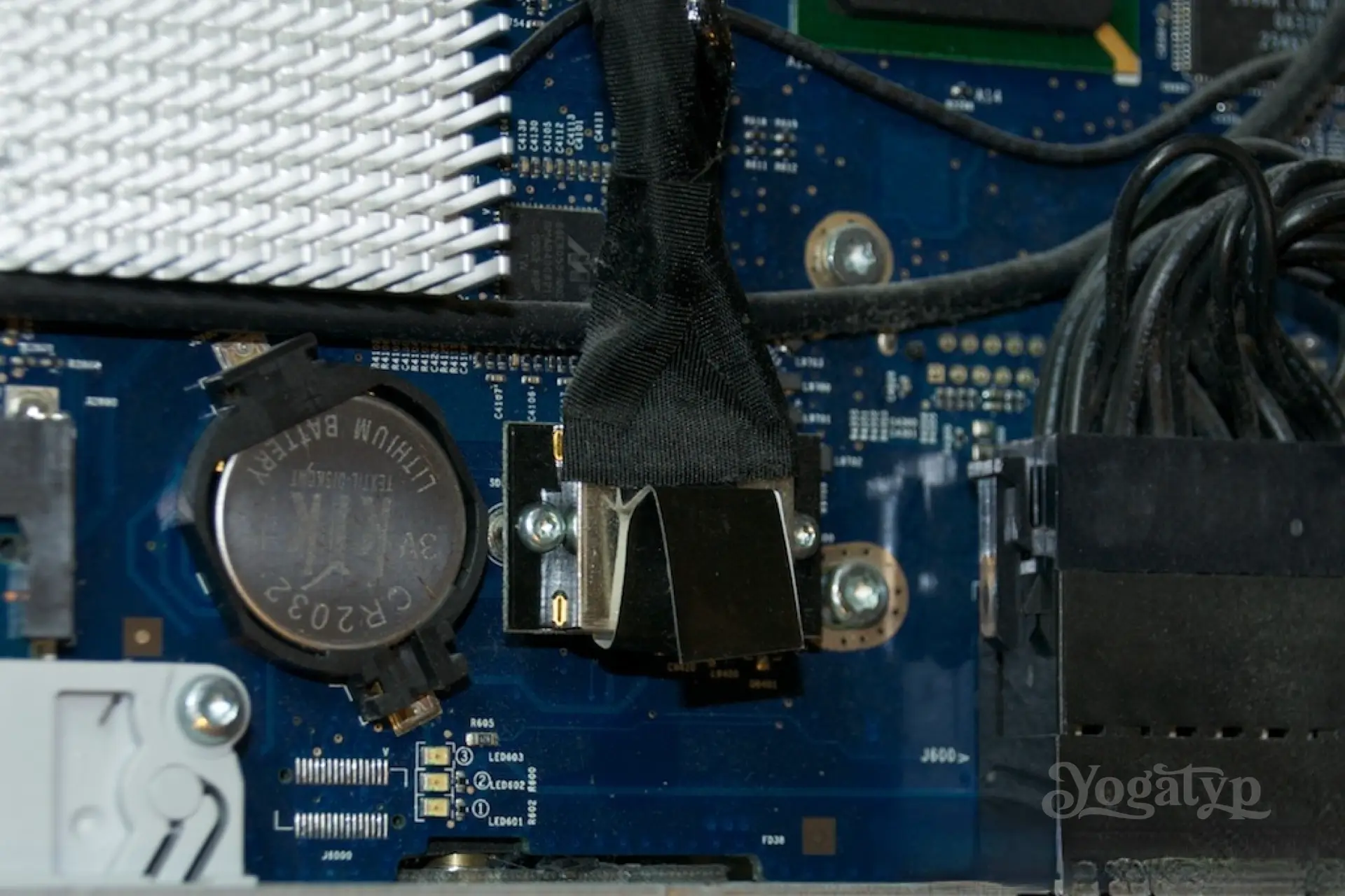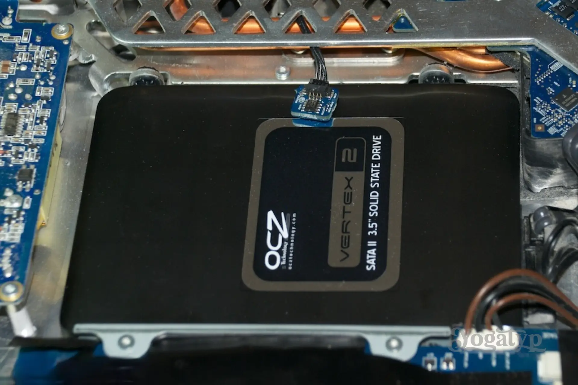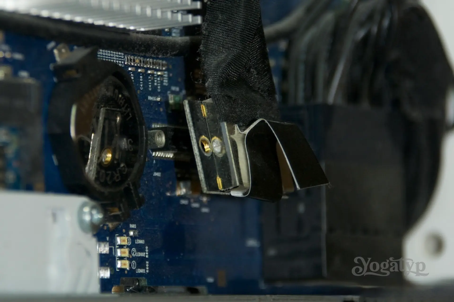 Als nächstes ersetzen wir die Festplatte durch die SSD und kleben, das ist sehr wichtig, den Temperatursensor auf die ungefähr gleiche Stelle wie zuvor auf die SSD. Ist die SSD kleiner als 3,5″, so muss man natürlich einen entsprechenden Adapter auf 3,5″ hernehmen. Danach wird alles rückwärts abgewickelt. Beim Aufsetzen des vorderen Rahmens darf nicht vergessen werden, die unteren Arretierhebel erneut kurz in den Speicherschacht zu drücken. Sind dann die Konnektoren für Kamera und Mikrofon gesteckt, sollte man, und das ist unser goldwerter Tipp, erstmal Mac OS X starten und die Funktion von Kamera und Mikrofon prüfen. Ist nämlich hier eine Steckverbindung noch nicht richtig, muss man nicht erneut an den Klammern vorbei. Abschließend wird gleichmäßig der vordere Rahmen das letzte Stück nach hinten geschoben, bis unsere liebgewonnen Halteklammern mit deutlichem Klicken eingerastet sind.