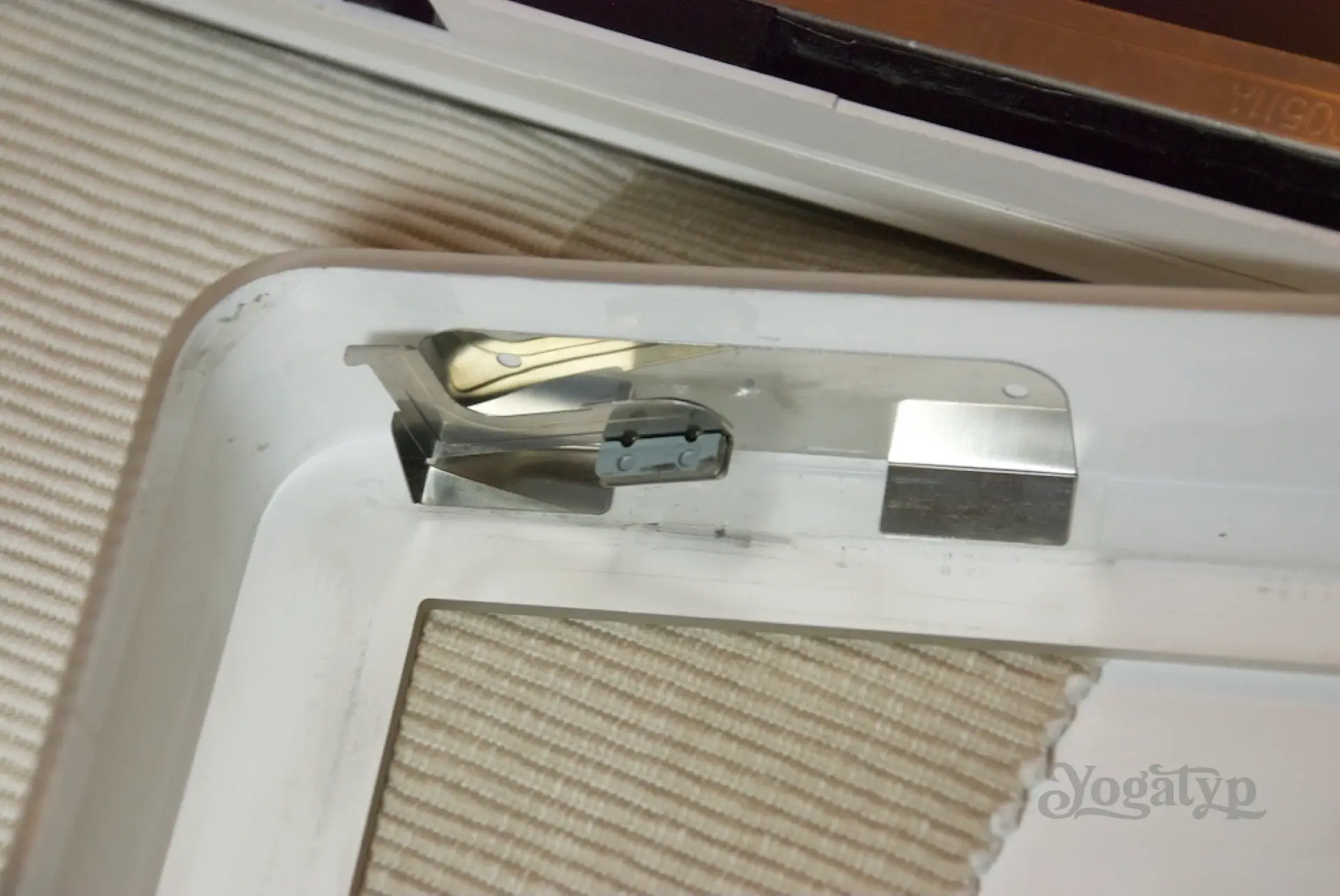 Nun kommt gleich zu Beginn der wirklich schwierigste Schritt der ganzen Prozedur und das kann dauern. Der vordere weiße Kunststoffrahmen, der praktisch auf das eigentliche Gehäuse gestülpt ist, soll entfernt werden. Den unteren Teil haben wir mit den letzten 6 Schrauben schon beweglich gemacht. Fehlt noch oben. Unsichtbar oberhalb des Bildschirms und innerhalb des vorderen Rahmens halten zwei Metallklammern den Rahmen am Gehäuse. Die Klammern sind Bestandteil des vorderen Elements und zwei wirklich fiese Gesellen. Hat man zum ersten Mal mit diesen Klammern zu tun, so ist eine geschlagene Stunde bis zum Erfolg keine Seltenheit.