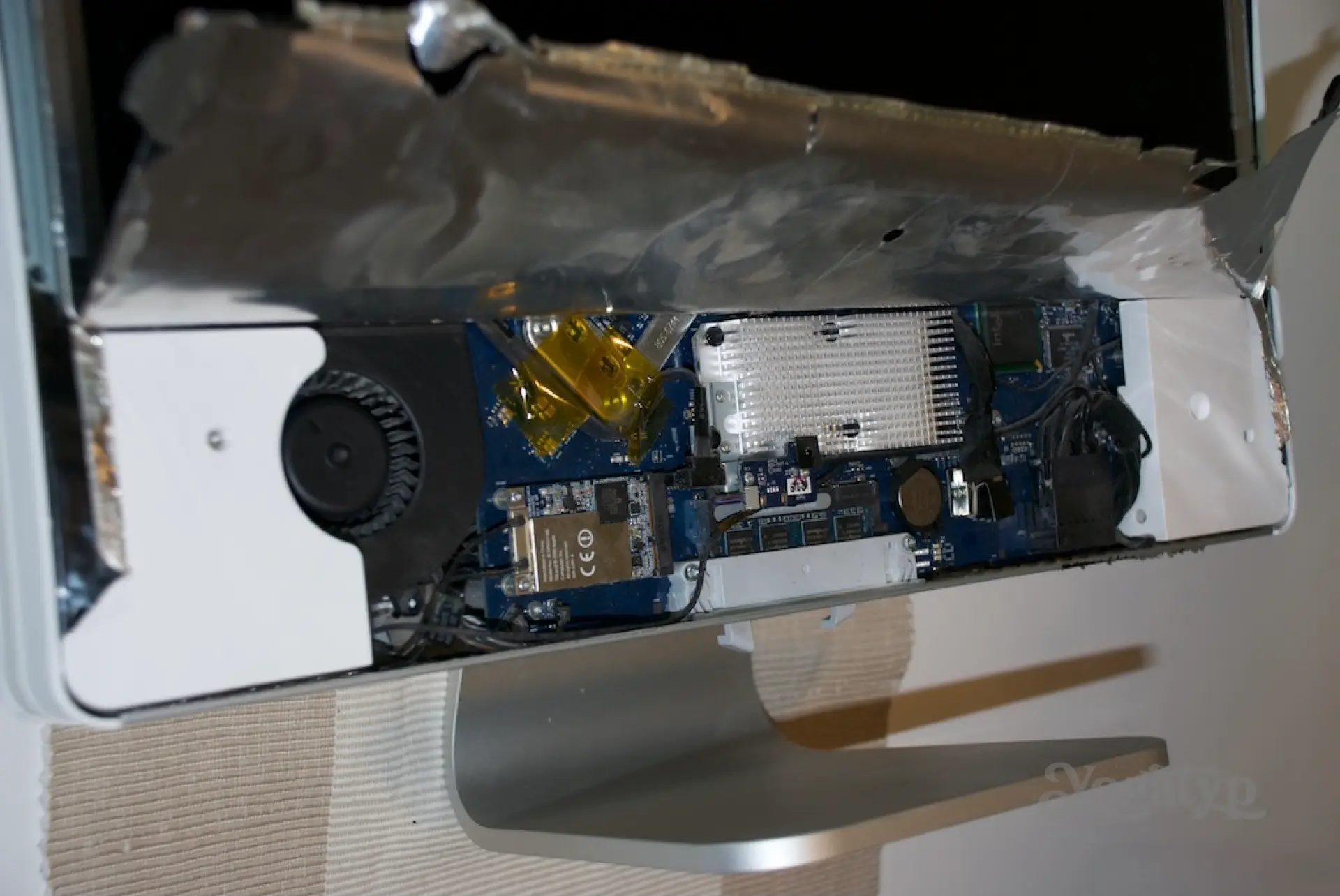 Als nächstes wollen wir den Bildschirm entfernen, welcher von 4 Schrauben gehalten wird. Diese Schrauben sehen wir, wenn wir am linken und rechten Displayrand die Alufolie lösen und wegklappen. Nun kann man tief zwischen Rahmen und Display die 4 T10 Schrauben sehen. Die Kunst ist es dabei, so behutsam vorzugehen, dass man diese Schrauben nicht verliert. Sollten diese unter die Hauptplatine rutschen, wirds haarig… Also langsam und was Magnetisches oder eine Spitzzange benutzen. Sollte das Kind in den Brunnen gefallen sein, so kann man nach Entfernen des Bildschirms den Mac auch hochnehmen, dann umdrehen und mit etwas Bewegung, Erdgravitation und einer Portion Glück die Schrauben wiedersehen.
