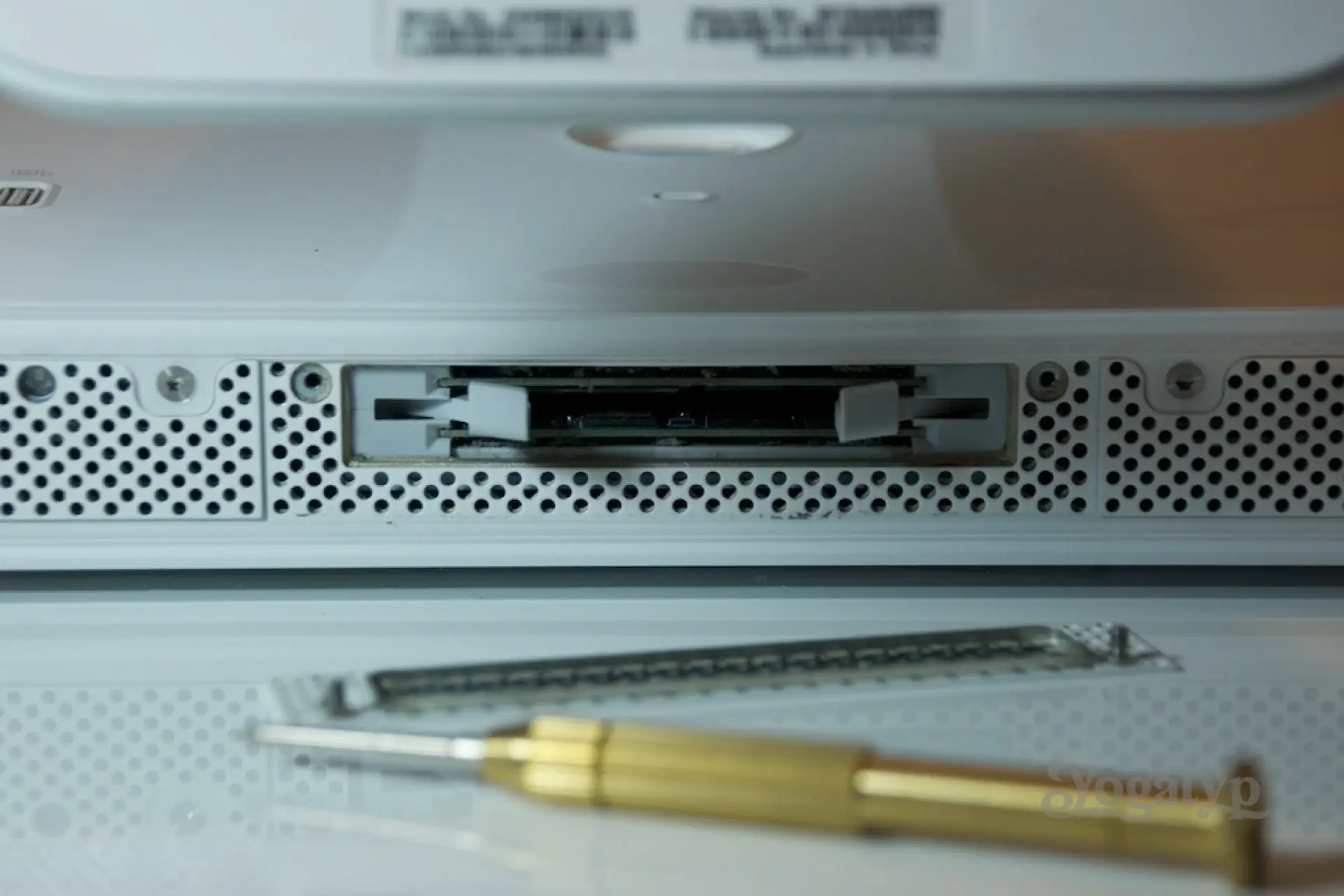 Der iMac wird mit dem Display nach unten auf ein weiches Tuch gelegt, so dass wir auf die Unterseite blicken. Links und rechts vom Speicherschacht sehen wir vier T8 Schrauben. Diese entfernen wir und legen sie sorgsam auf ein weisses Blatt Papier, wo wir sogleich notieren, welche das sind. Als nächstes lösen wir die zwei Phillips Schrauben, welche die Klappe zum Schacht für die Speicherriegel halten.