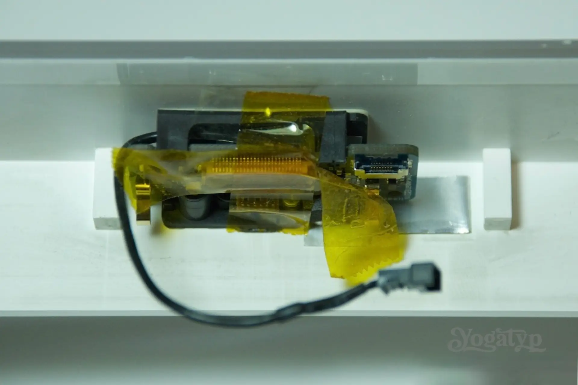 Sind die Klammern gelöst, zieht man also das große vordere Element weg vom Gehäuse. Dabei müssen unten die Arretierhebel für die RAM-Module etwas in den Speicherschacht gedrückt werden, damits vorbei geht. Jetzt den Rahmen nach oben ziehen und oben in der Mitte die Steckverindungen für Mikrofon und Kamera sehr vorsichtig lösen, denn es sind heikle kleine Stecker. Den Klebefilm muss man hierzu einschneiden bzw. abziehen. Wir legen den Rahmen weg und lösen als nächstes vom unteren Gehäuserand (und links und rechts) die schwarze Folie und klappen diese nach oben weg auf den Bildschirm, um einen ersten Blick auf das Innenleben zu erhaschen. Rechts blicken wir auf den Displaystecker mit seiner Zughilfe und zwei T6 Schrauben, welche wir lösen. Mittels der Zughilfe ziehen wir den Stecker vorsichtig und gerade nach oben ab.